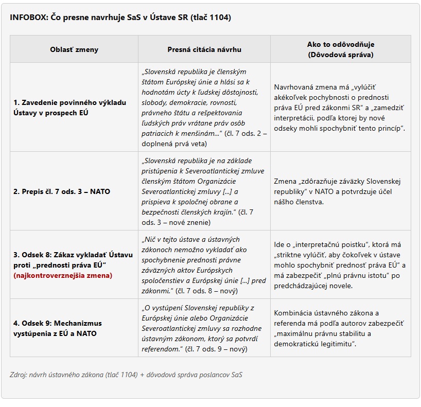 Skupina poslancov SaS predložila návrh, podľa ktorého sa má Ústava vykladať tak, aby „neohrozovala povinnosti SR vyplývajúce z členstva v EÚ a NATO“. Ide o najradikálnejší zásah do suverenity od roku 1993.