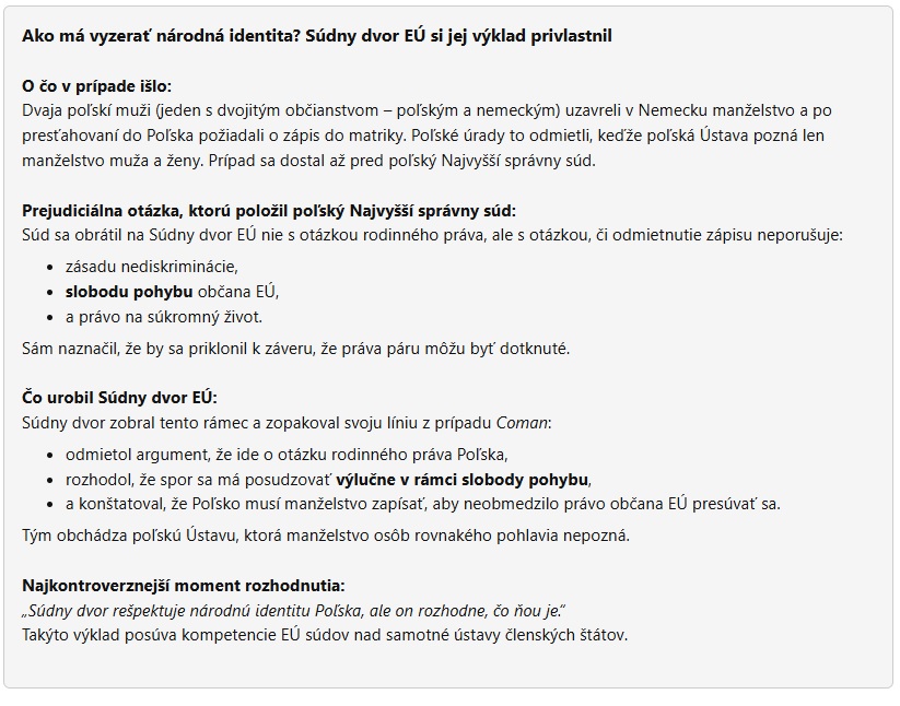 Najvýraznejším príkladom je nedávny prípad dvoch Poliakov. Poľsko odmietlo zapísať homosexuálne manželstvo uzavreté v Nemecku, lebo ho jeho Ústava nepozná. Poľský Najvyšší správny súd sa obrátil na Súdny dvor EÚ s otázkou, či odmietnutie nezasahuje do slobody pohybu. Súdny dvor rozhodol, že áno — a tým obišiel poľskú Ústavu. Ak členský štát nechce niečo uznať, EÚ si môže nájsť inú právomoc a rozhodnúť za neho.