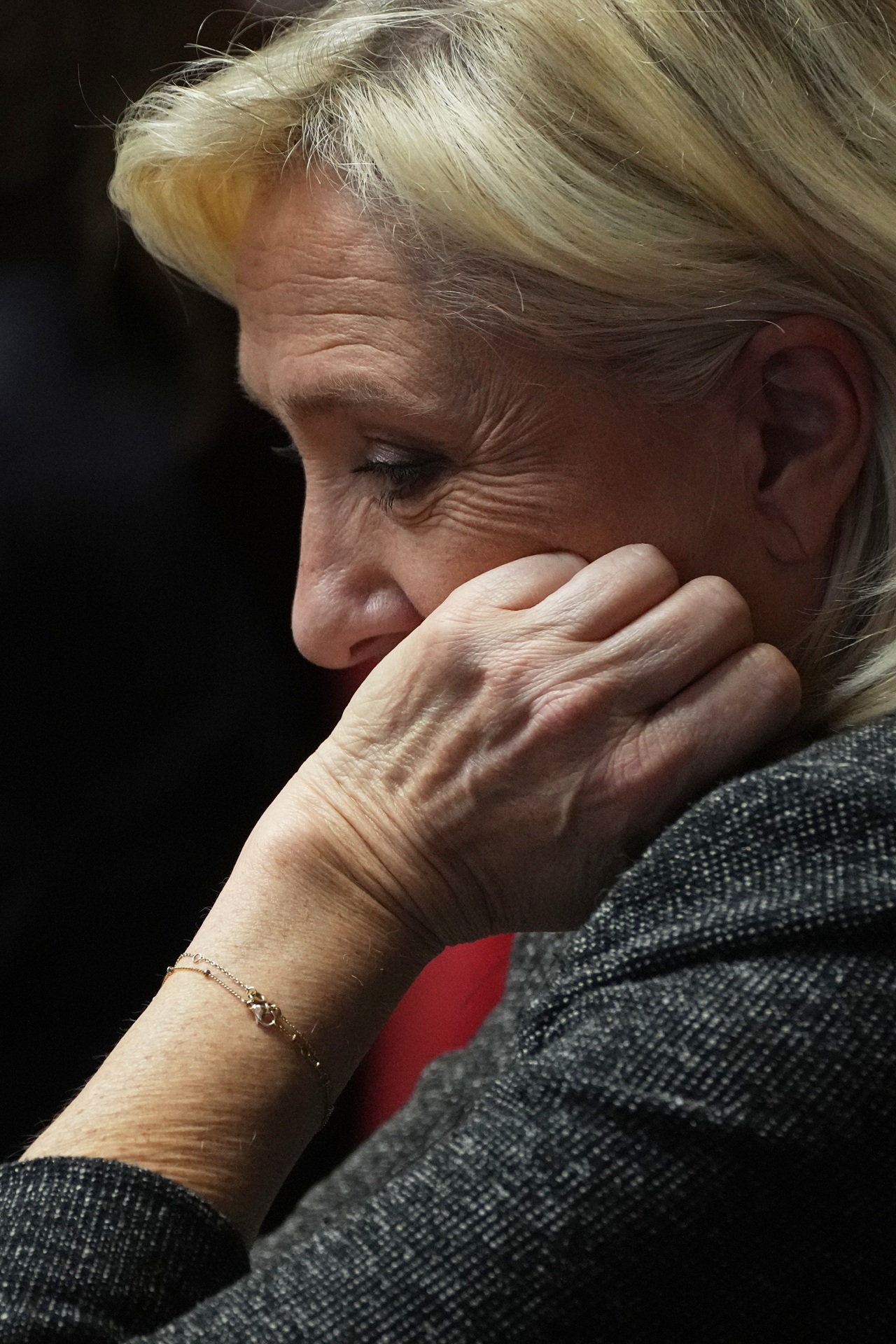 Na snímke francúzska pravicová líderka Marine Le Penová reaguje na prejav francúzskeho premiéra Sebastiena Lecornu v Národnom zhromaždení v utorok 14. októbra 2025 v Paríži. / Foto: TASR AP Photo/Thibault Camus