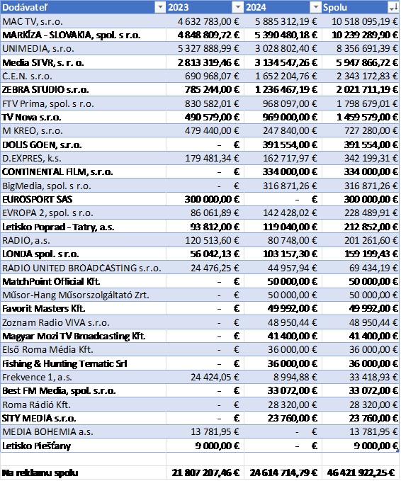 No realita rokov 2023 a 2024 hovorí presným opakom. Štátne agentúry podriadené Ministerstvu cestovného ruchu a športu (Slovakia Travel a TIPOS) vyliali v rokoch 2023 a 2024 do mainstreamových médií spolu viac ako 46 miliónov eur. Medzi najväčších prijímateľov patrili Markíza, MAC TV (JOJ), Media STVR (RTVS), C.E.N. (TA3) a ďalší veľkí hráči. Suma, ktorá sa nedá ospravedlniť kampaňami, sezónnym cestovným ruchom ani technickými limitmi systému.