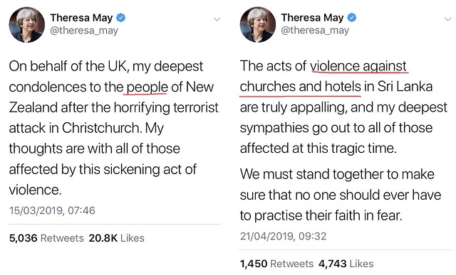 Tentokrát, keď podľa predbežných zistení kresťanov útočili moslimskí samovražední útočníci s vidinou okamžitého neba a blahobytu, pričom zabili predbežne 290 kresťanov a viac ako 600 sa vážne zranilo, Mayová sa neodváži hovoriť o teroristoch vychádzajúcich z islamskej ideológie a o besniacom vraždení hovorí ako o “útokoch na kostoly a hotely”.