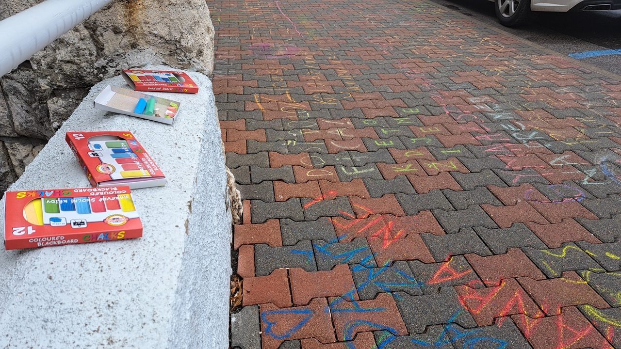 Na snímke kriedy a nápisy na chodníku pred Okresným úradom v Poprade / Foto: TASR-Adriána Hudecová