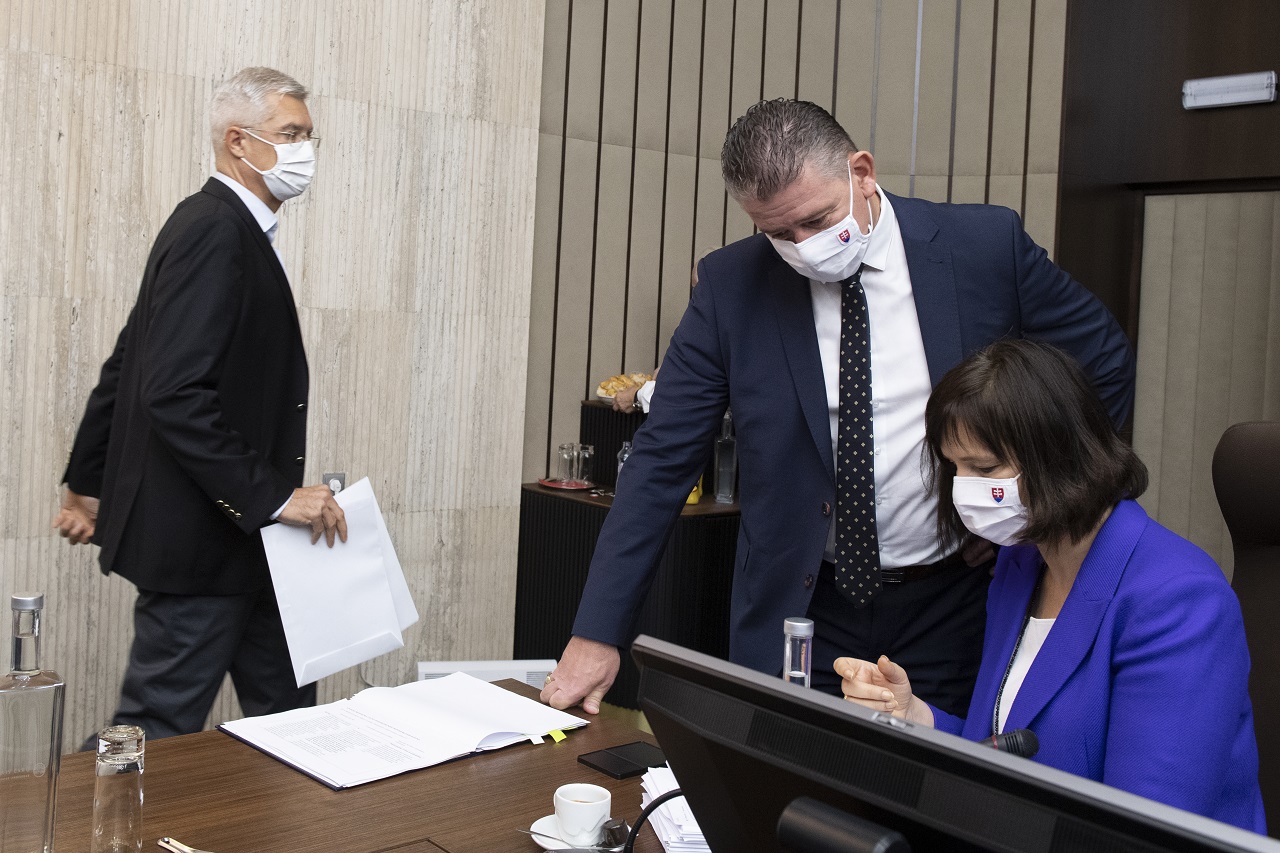 Na snímke sprava podpredsedníčka vlády a ministerka investícií, regionálneho rozvoja a informatizácie SR Veronika Remišová (Za ľudí), minister vnútra Roman Mikulec (OĽaNO) a minister zahraničných vecí a európskych záležitostí Ivan Korčok (nominant SaS)