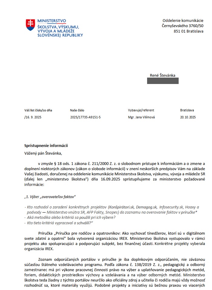 O skutočnosti, že Ministerstvo školstva šíri medzi rodičmi a školami príručku vytvorenú v rámci britsko-amerického programu, sme písali viac (tu) a bezprostrednú reakciu ministerstva na náš článok, v ktorej označili naše tvrdenia za „klamstvá“, „hoaxy“ a „konšpirácie“  sme analyzovali (tu).