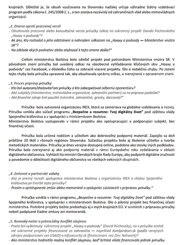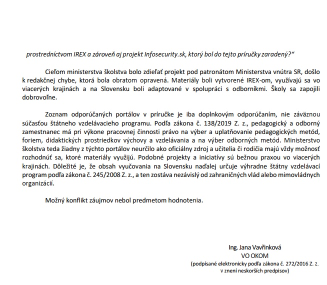 Inými slovami – ministerstvo sa vôbec nezaoberalo tým, že britská vláda, ktorá financovala príručku prostredníctvom IREX, financuje aj projekt Infosecurity.sk, uvedený v tej istej príručke ako odporúčaný zdroj.