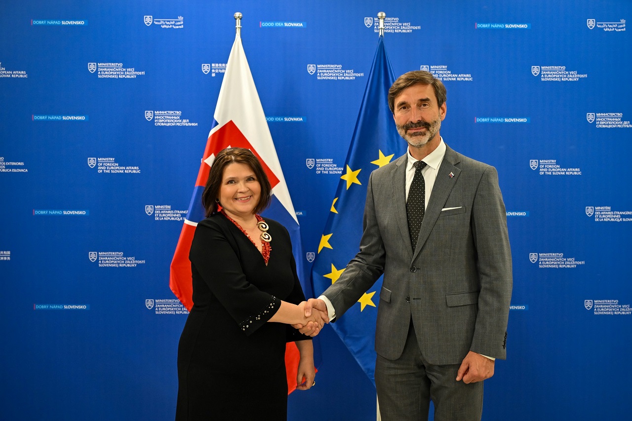 Na snímke minister zahraničných vecí a európskychzáležitostí Juraj Blanár (Smer-SD) a nová slovenská veľvyslankyňa v Severnom Macedónsku Iveta Hricová / Foto: TASR-MZVEZ