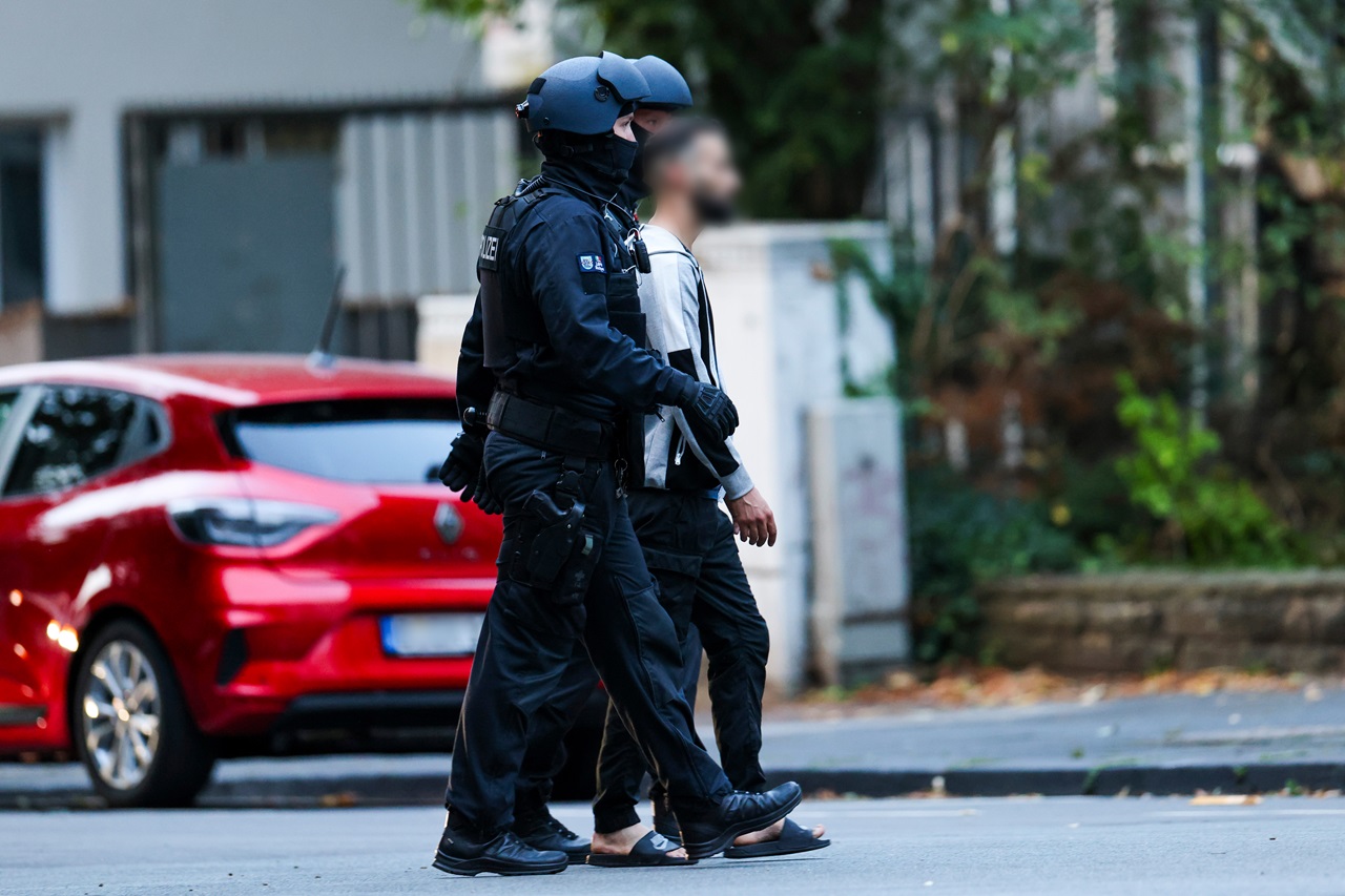 Príslušníci špeciálnej policajnej jednotky zatýkajú muža počas policajnej operácie v ubytovacom zariadení pre utečencov v meste Solingen v spolkovej krajine Severné Porýnie-Vestfálsko na západe Nemecka
