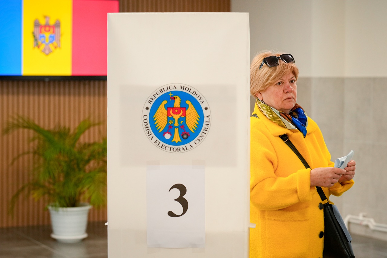 Na snímke žena vychádza z volebnej miestnosti počas parlamentných volieb v Kišiňove v Moldavsku v nedeľu 28. septembra 2025 / Foto: TASR/AP-Vadim Ghirda