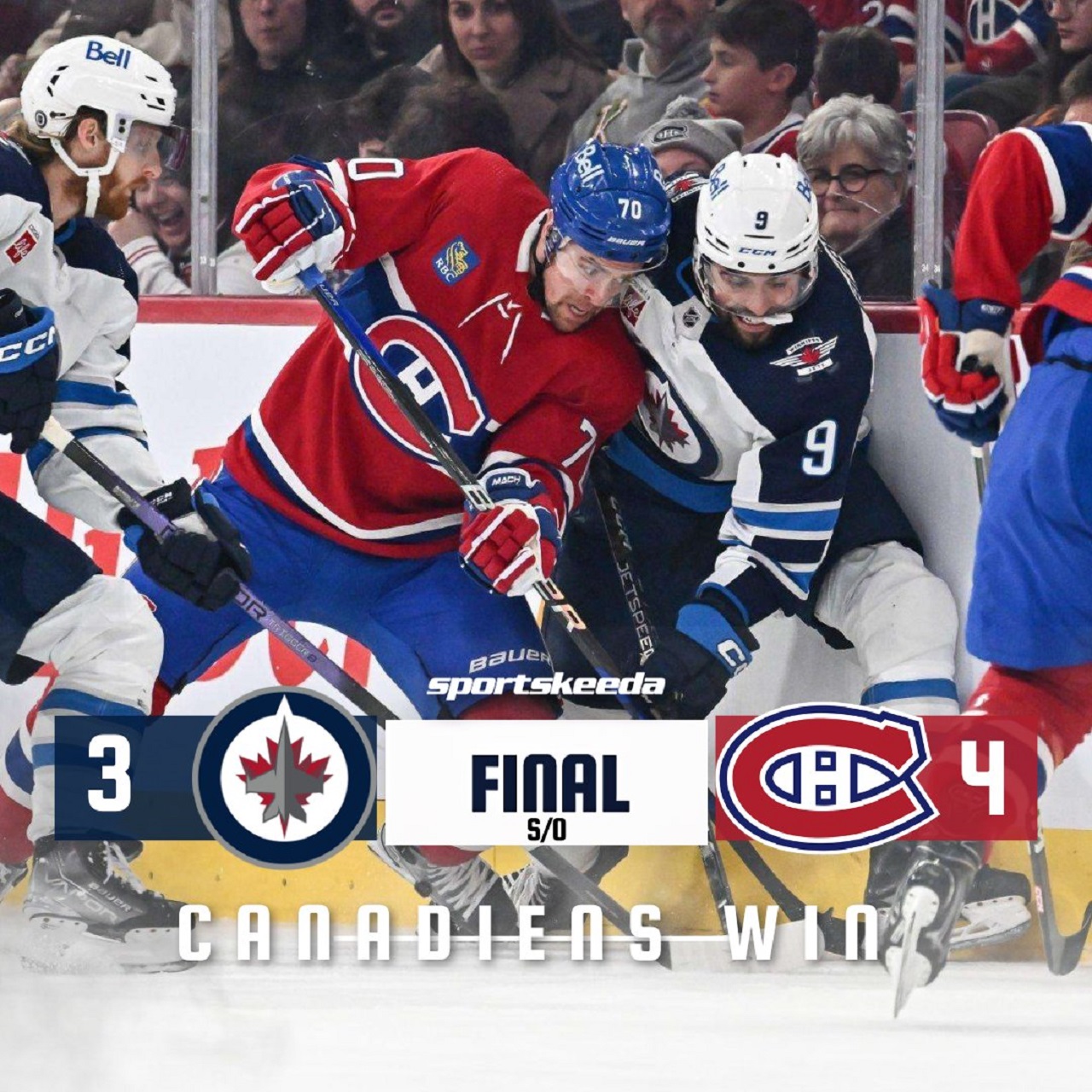 Jets viedli gólom kapitána Adama Lowryho, ktorý si premeneným nájazdom v 5. minúte otvoril strelecký účet v sezóne. O 37 sekúnd neskôr síce vyrovnal obranca Justin Barron, ale v prvej minúte druhej tretiny strelili hostia dva rýchle góly. V 15. sekunde sa opäť presadil Lowry a v 33. zvýšil na 3:1 Nino Niederreiter, keď potrestal stratu puku Slafkovského za bránkou. Canadiens od tohto momentu už neinkasovali a k obratu prispel skvelým výkonom aj brankár Jake Allen, ktorý zlikvidoval 42 striel. Na 2:3 znížil Sean Monahan a do predĺženia poslal duel fínsky útočník Joel Armia, ktorý tak úspešne oslávil sezónny debut v NHL po tom, ako začal na farme. “Podržal ich brankár, mohli sme vyhrávať o tri, štyri góly. Napriek prehre sme s výkonom spokojní,” povedal asistent trénera Winnipegu Scott Arniel. Slafkovský podľa pokročilých štatistík podal najhorší výkon v sezóne a tréner St. Louis ho od druhej polovice tretej tretiny už na ľad neposlal. Slovenský útočník nebodoval v siedmom zápase za sebou, na konte má len jednu asistenciu z úvodného duelu sezóny. Canadiens otočili druhýkrát za sebou duel z viacgólového manka, čo sa okrem nich podarilo v tomto ročníku len Torontu a Chicagu. “Mali sme zlý štart do druhej tretiny, ale páči sa mi ako sme zareagovali. Ukázali sme charakter,” povedal Suzuki. Duel pre zranenie nedohral obranca Montrealu Mike Matheson.