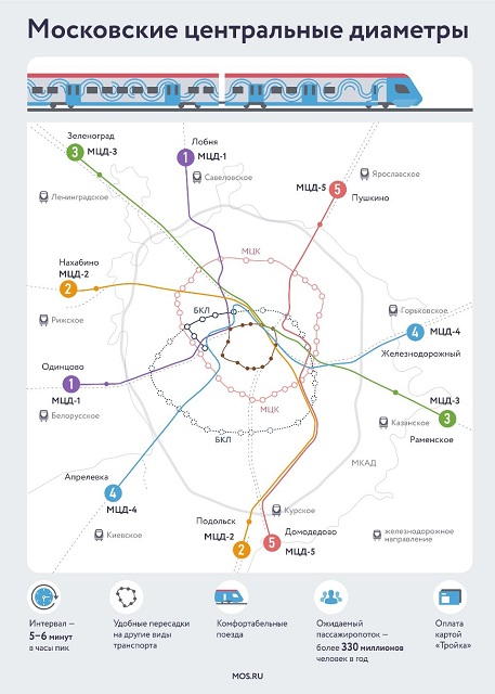 Veľkým prínosom bolo otvorenie Moskovského centrálneho okruhu v r. 2016, ktoré Moskovčania nazývajú pozemné metro, aj keď tam premávajú moderné osobné vlaky. Stanice Moskovského centrálneho okruhu boli prispôsobené tak, aby cestujúci mohli v pohode prestupovať zo staníc tohto okruhu do metra, z jedného druhu dopravy do ďalšieho. V súčasnosti pasažieri rovnakým spôsobom budú prestupovať aj na staniciach Moskovských centrálnych diametrov, pričom budú pokojne pokračovať v ceste: prestupy sú zdarma a na všetkých druhoch dopravy platia rovnaké cestovné preukazy.