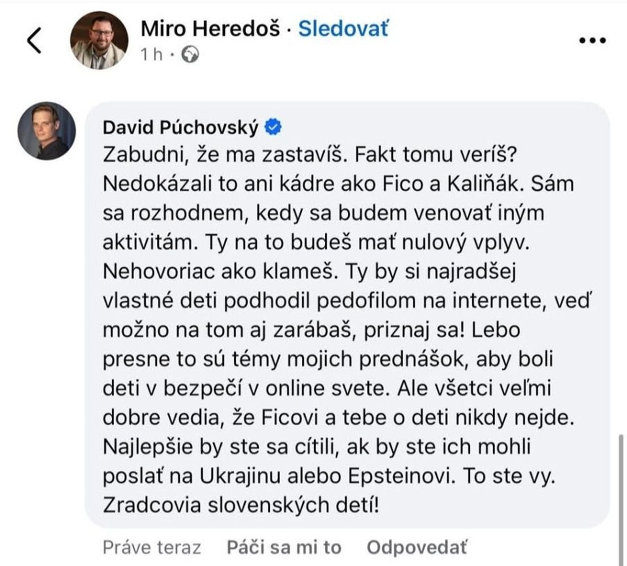 „Osobne som zhrozený. David Púchovský – ako asistent poslanca Spišiaka z PS, ktorému posielame mesačne 3665 eur ako plat – vyprodukoval takúto prízemnosť. Podľa neho „by som najradšej vlastné deti podhodil pedofilom na internete“, „možno na tom aj zarábam“ a mám sa „priznať“…. A že najlepšie by som sa spoločne s Ficom „cítil, keby som naše deti poslali na Ukrajinu alebo Epsteinovi“..,“ zhrnul v úvode nedávneho príspevku Heredoš.