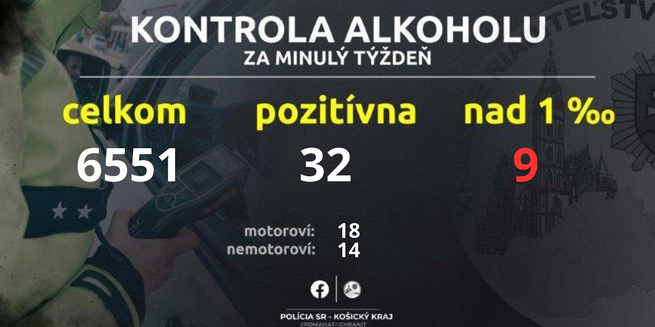 V rámci bežného výkonu služby policajti odhalili deväť vodičov s alkoholom do jedného promile, päť vodičov s alkoholom nad jedno promile a desať vodičov pod vplyvom omamných látok. „Okrem vodičov bolo prichytených aj 14 nemotorových účastníkov pod vplyvom alkoholu,“ uviedla polícia.