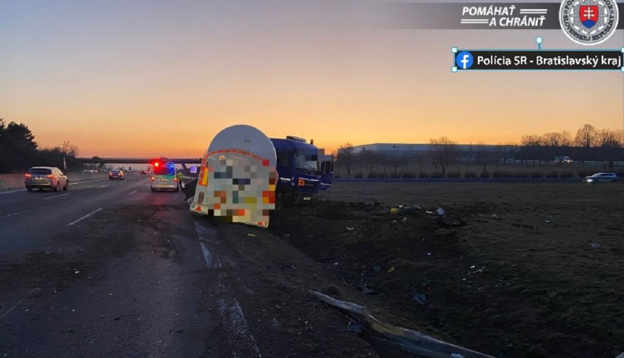 Na približne 27. kilometri diaľnice D1 v smere do Bratislavy havaroval kamión s cisternou. V úseku je momentálne prejazdný len ľavý jazdný pruh. Informuje o tom polícia na sociálnej sieti