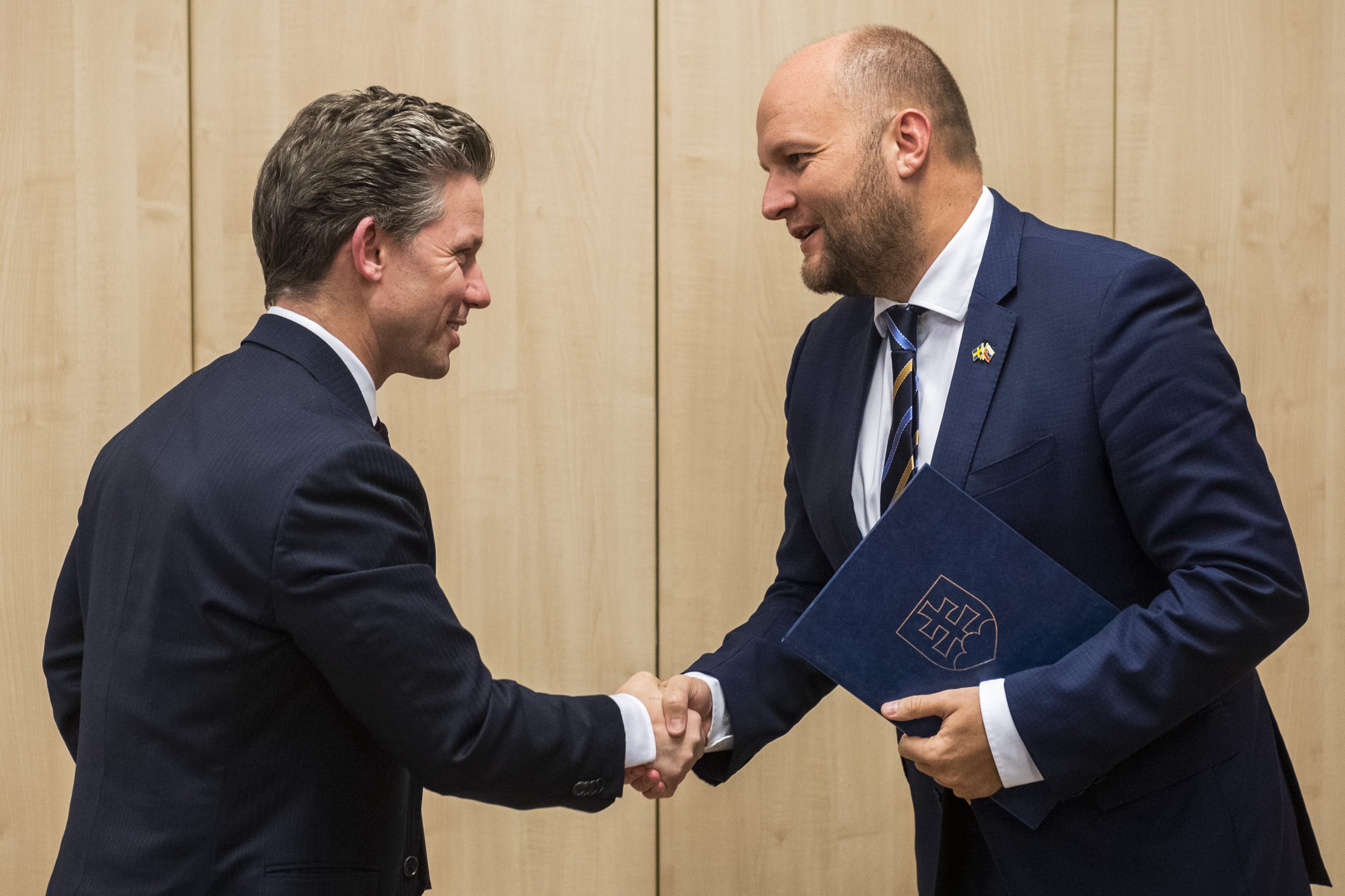 Na snímke zľava minister obrany SR Jaroslav Naď (OĽaNO) a švédsky minister obrany Pal Jonson počas prívítania pred spoločným rokovaním v Bratislave 14. decembra 2022