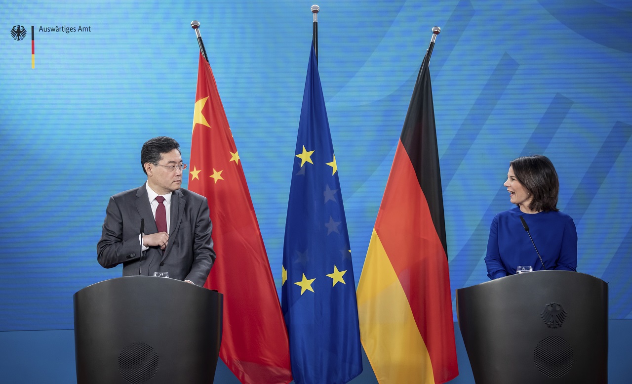 Na snímke vpravo nemecká ministerka zahraničných vecí Annalena Baerbocková a čínsky šéf diplomacie Čchin Kang počas tlačovej konferencie po spoločnom rokovaní v Berlíne