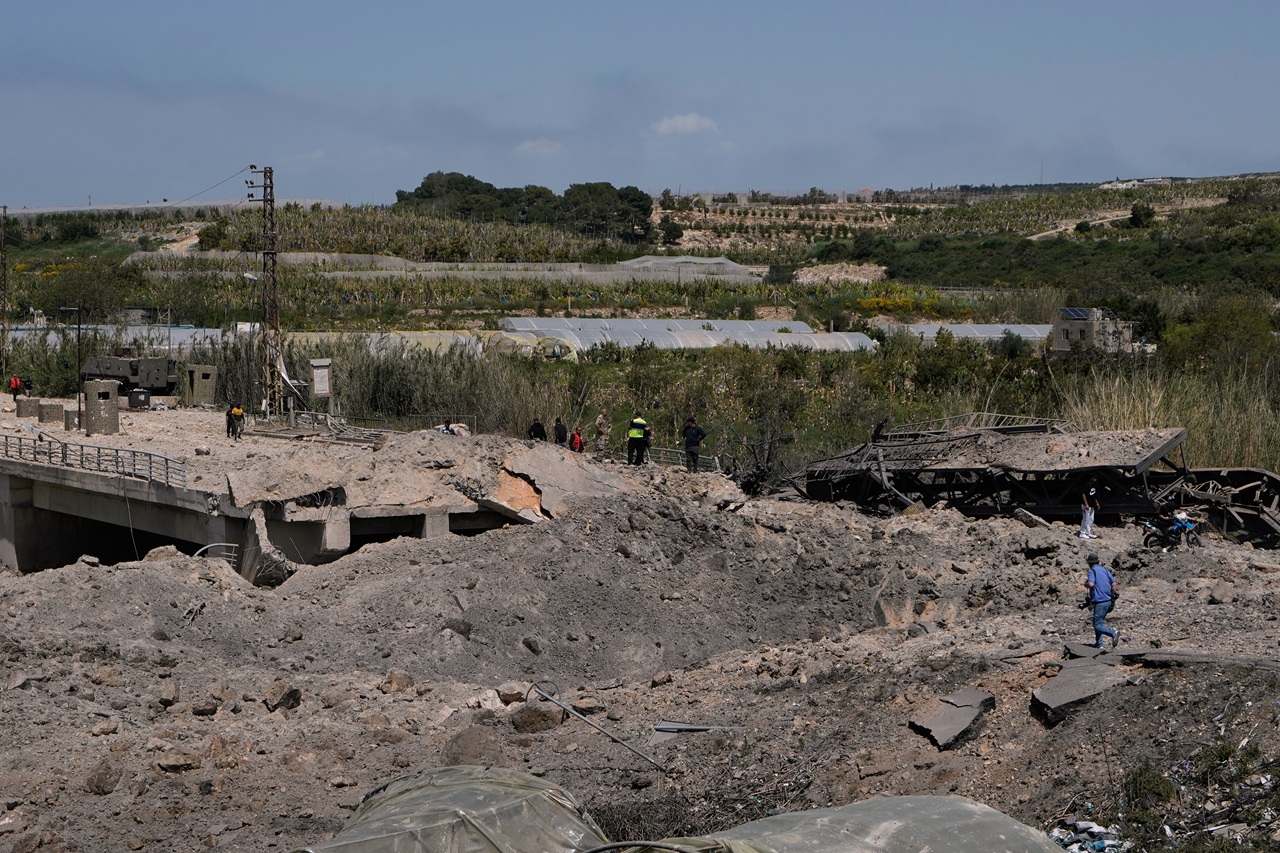 Ľudia kráčajú cez kráter po izraelských leteckých útokoch, ktoré zničili most Kasmijíh neďaleko prístavného mesta Tyre, v južnom Libanone vo štvrtok 16. apríla 2026 / Foto: TASR/AP-Mohammed Zaatari