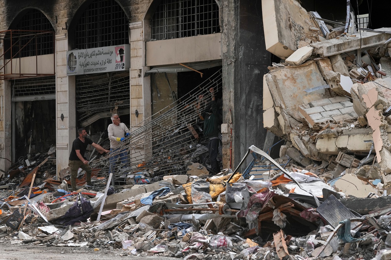 Libanončania odstraňujú ruiny zo svojich zničených obchodov v meste Nabatíja na juhu Libanonu počas druhého dňa prímeria medzi libanonským militantným hnutím Hizballáh a Izraelom v sobotu 18. apríla 2026 / Foto: TASR/AP-Mohammed Zaatari