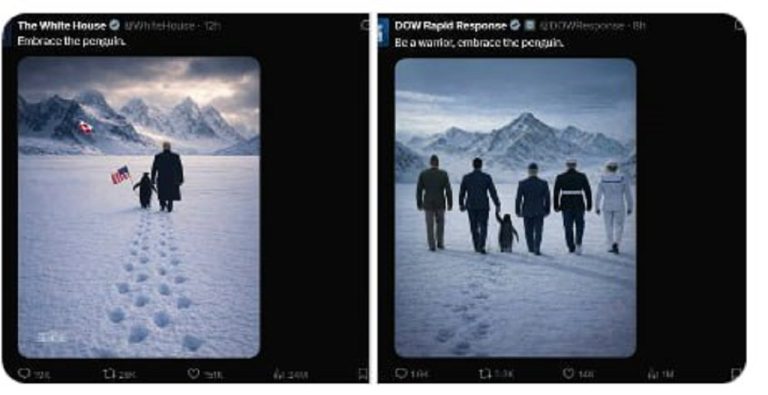 Na svojich účtoch na X zverejnili obrázky vytvorené umelou inteligenciou, na ktorých Trump a americkí vojaci kráčajú ruka v ruke s tučniakom po krajine pripomínajúcej Grónsko, s grónskou vlajkou v pozadí. „Objím tučniaka“ a „Buď bojovníkom, objím tučniaka“, vyzývajú Biely dom a ministerstvo vojny.