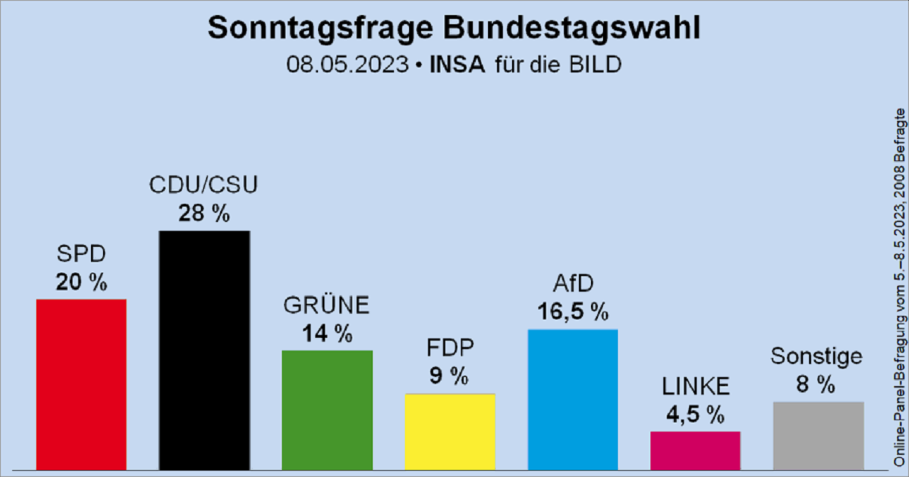 Podľa všetkých ôsmich hlavných prieskumov verejnej mienky v Nemecku má Alternatíva pre Nemecko (AfD) v súčasnosti 15 až 17 percent hlasov, avšak údaje inštitútu Insa tiež ukazujú, že strana má priestor na rast.