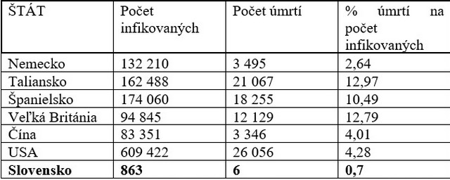Výber šiestich v tabuľke uvedených štátov prebehol na základe ich veľkosti a dôležitosti v európskom a svetovom meritu. Slovensko ako siedme a na konci tabuľky, dokumentuje naše postavenie v porovnaní s menovanými krajinami. Uvedené čísla sú ku dňu 15. 4. 2020 okrem Slovenska, kde sú údaje o deň aktálnejšie.
