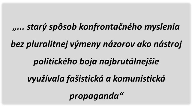 Nálepky ako: tu je môj výrobok, ale pozor na konkurenciu – to je samý starý šmejd… to určite nekupujte (nevoľte). Tento starý spôsob konfrontačného myslenia a nastoľovania tém v spoločnosti – ale bez pluralitnej výmeny názorov – ako nástroj politického boja najbrutálnejšie využívala fašistická a komunistická propaganda. Po „prevzatí moci“ okamžite nastolili diktatúru a totalitu jediného (správneho) názoru a postoja; začali nielen politických, ale aj svetonázorových oponentov s inými slobodnými, alternatívnymi postojmi a hodnotami segregovať alebo priamo likvidovať. Staré myslenie je vskutku „progresívne“ na efektívne uchopenie moci10)a nastolenie slniečkárskej pseudo „liberálnej“ totality, alias riadenej demokracie, ktorá vraj nie je pre všetkých…11) V programových tézach Progresívneho Slovenska sa už objavilo progresívne novátorské riešenie zriadiť ďalší byrokraticko-dozorný orgán – Splnomocnenca vlády pre dezinformácie. Áno, čítate správne: pre dezinformácie! Niečo ako Úrad propagandy, Gestapo, NKVD, ŠtB… alebo lustračné komisie, posudzujúce správnosť, uvedomelosť postojov alebo angažovanosť občanov pre „novú spoločnosť“…