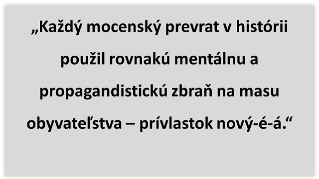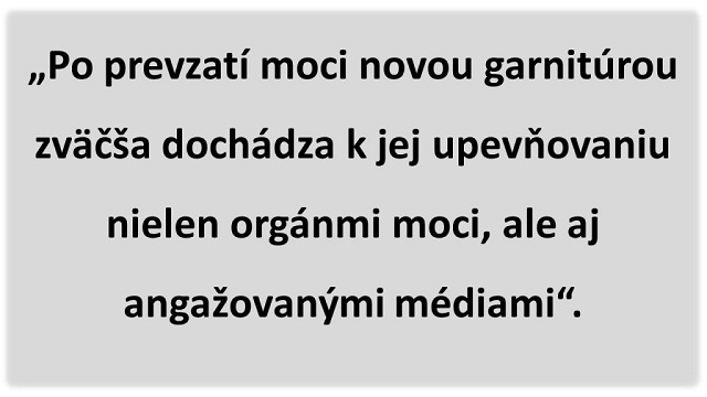 Po prevzatí moci novou garnitúrou zväčša dochádza k jej upevňovaniu nielen orgánmi moci, ale aj angažovanými médiami. Slovensko je liberálno-slniečkársky výnimočné, pretože tu už takmer 30 rokov médiá stoja na tej „správnej“ strane a úporne bojujú proti starým nacionalistickým tmárom, stereopytom, neofašistom a extrémistom. Len sa pridala aj nová kategória homofóbov a islamofóbov, ktorí kazia multikultúrny pohľad na spoločnosť. Nová progresívna politická sila vyzbrojená novými liberálnymi ideológiami 12)disponuje ešte pred prevzatím moci 13) mediálnymi zbraňami hromadného ničenia oponentov, nacionalistov, „zaprdených Hejslovákov“, antisemitov, extrémistov, xenofóbov… Má aj vycvičenú armádu novinárskych presstitútov, ktorí dlhé roky mieria hľadáčikom na nepriateľské osoby a politikov.