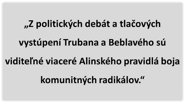 V USA bola alinského metóda účinná najmä v sociálne slabších ghetach, radikalizovala slabšie sociálne, etnické a marginalizované skupiny na dožadovanie sa svojich práv. Na Slovensku sú identické a historicky fixované podmienky. Liberálna, slniečkárska a neomarxistická agenda nespravodlivosti, rozkrádania štátu a „starých“ politikov, strán a poriadkov fixovaná na „starý“ nacionalizmus a národný štát zaberá nielen na nízkopríjmové skupiny obyvateľstva. Ide o taktiku bičovania najmä negatívnych emócií, vyplavujúcich sa z historicky zdedenej závisti, pocitu ukrivdenia a škodoradosti…16) Z politických debát a tlačových vystúpení Trubana a Beblavého sú viditeľné viaceré alinského pravidlá boja komunitných radikálov. Ide najmä o body 2. a 3., kedy Truban opakovane odmieta vtiahnuť sa do diskusie a polemiky, ktorými sa utvára aj upevňuje demokracia, rešpektujúca pluralitu názorov. Truban nemotorne argumentuje alinského pravidlom číslo 4. – nechať nepriateľa, aby dodržiaval svoju vlastnú knihu pravidiel, ktoré sú však štandardné a všeobecné. Preto ich Truban označuje (name&shame) ako „staré“ alebo za konšpirácie. Vzápätí vytiahne pomôcku – pravidlo číslo 12. a sám a svoju politickú skupinu označí za „alternatívu“. Akurát alinského radu „konštruktívnu“ nahradili aj názvom politického subjektu ako „progresívnu“ eventualitu.