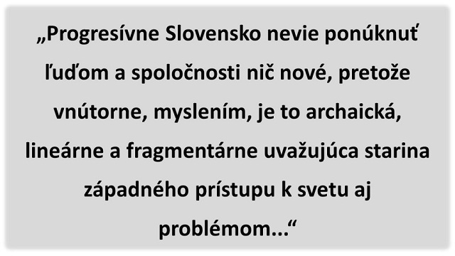 Jediné nové, čo však ponúkajú sú zatiaľ len ďalšie „nové“ liberálne politické subjekty. Progresívne Slovensko len opakuje scenár vzniku a uchytenia sa Matovičovho Hnutia obyčajných ľudí alebo Kollárovej strany Sme rodina, ktorá odmietla štandardnosť politikov. Návnadu vzdoru, obyčajnosti alebo neštandardnosti2) nahradili liberáli novým kľúčovým pojmom – progresívnosťa sľubmi o „novosti“. Vnímať štandardnú politiku3) ako „hádky starých politikov“, čiže spochybňovať názorovú konfrontáciu za účasti verejnosti a spätnej väzby verejnej mienky na praktickú politiku je súčasne útok na princípy demokracie. Paradoxne ľudia so zúženým „starým“ fragmentárnym, západným spôsobom myslenia šíria slogan, že oni spájajú Slovensko.