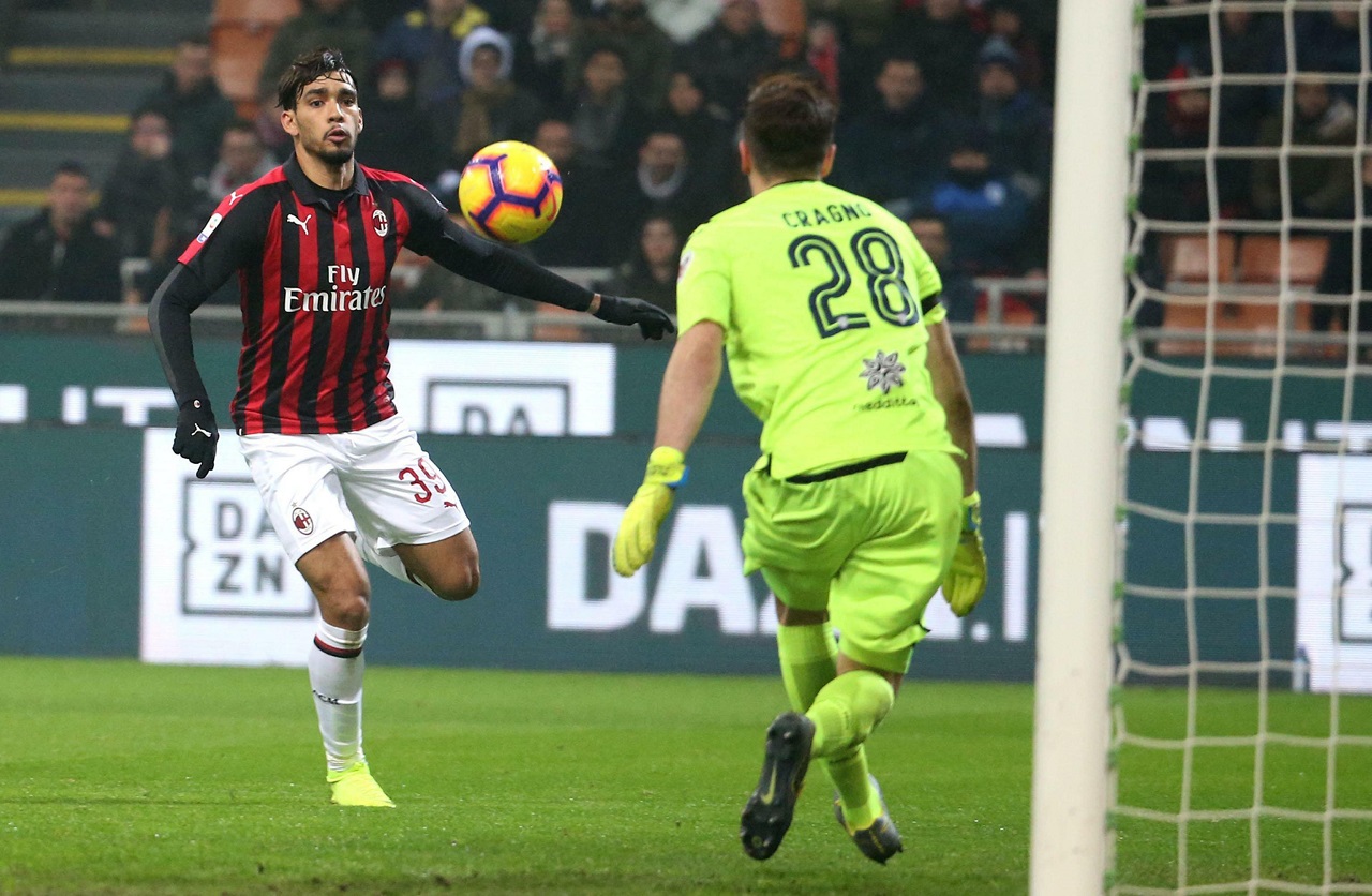 Hráč AC Milána Lucas Paqueta strieľa gól brankárovi Alessiovi Cragnovi z Cagliari