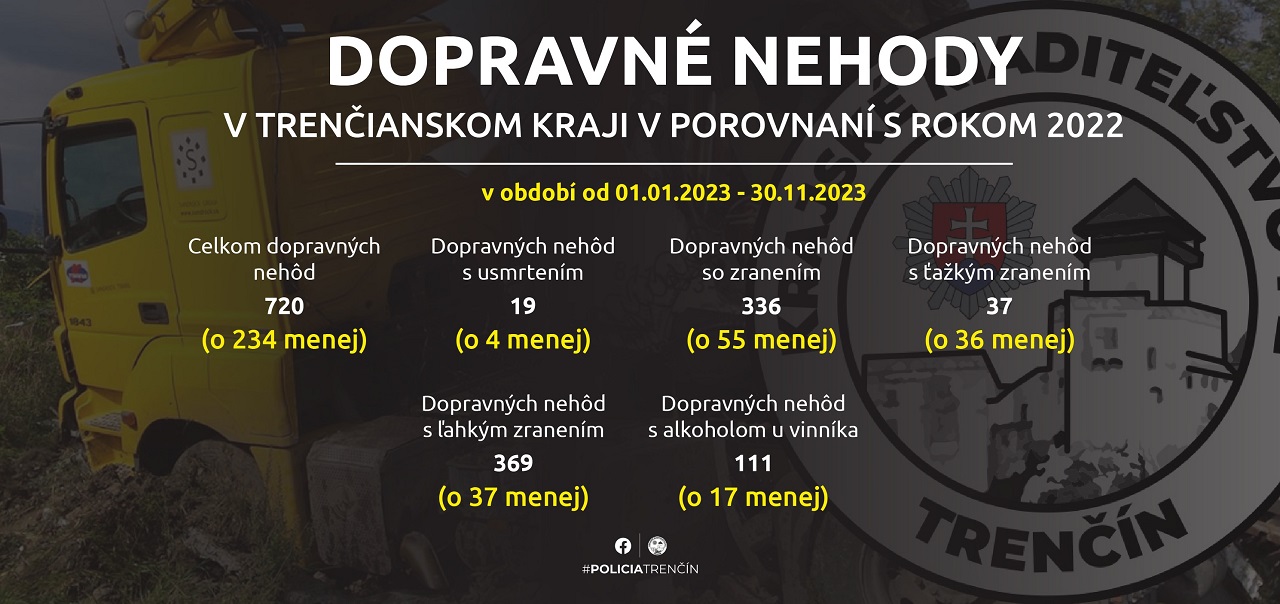 Od začiatku roka do konca novembra sa na cestách Trenčianskeho samosprávneho kraja (TSK) stalo 720 dopravných nehôd. Ich počet medziročne klesol o 234. Informovala o tom trenčianska krajská policajná hovorkyňa Katarína Kuzmová
