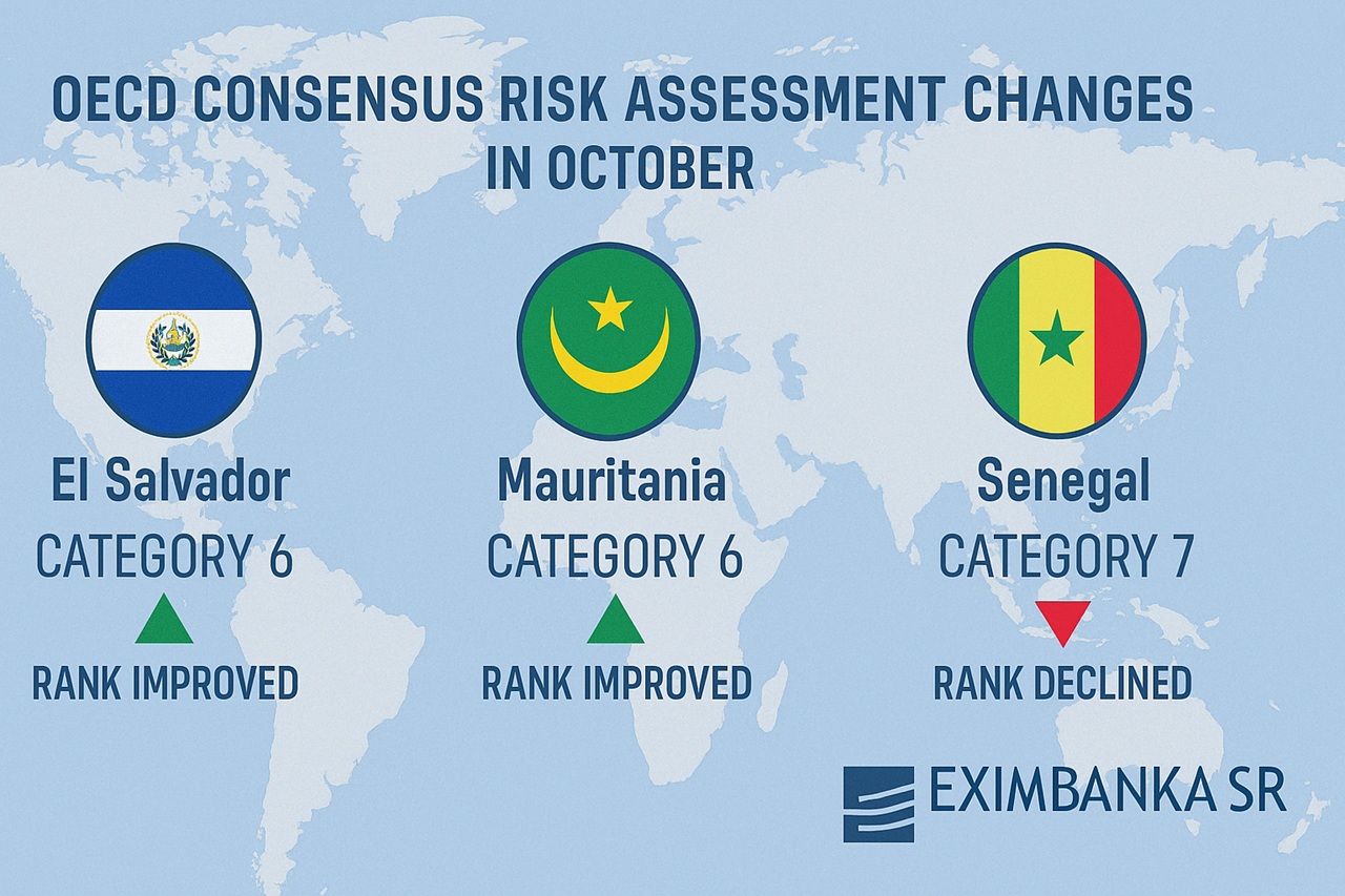 Na októbrovom zasadnutí Konsenzu OECD prehodnotili rizikovosť troch rozvojových krajín, a to Salvádoru, Mauritánie a Senegalu. Zatiaľ čo Salvádor a Mauritánia si v rebríčku rizika polepšili o jeden stupeň, Senegal zaznamenal zhoršenie. Zmeny v klasifikácii majú priamy dopad aj na činnosť exportno-úverových agentúr, vrátane slovenskej Eximbanky, pre ktoré od 10. októbra tieto krajiny predstavujú nové úrovne rizika pri poistení exportných obchodov
