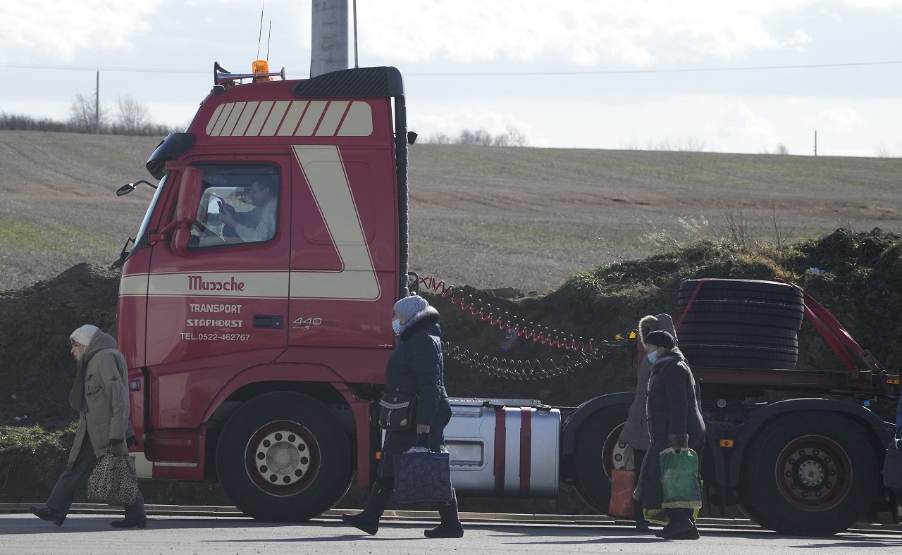 Ženy nesú tašky v poľskej obci Medyka neďaleko hraničného priechodu s Ukrajinou