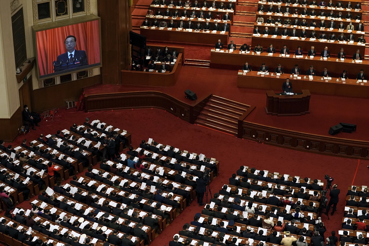 Na snímke parlamentná schôdza v Pekingu, uprostred za rečníckym stolom čínsky premiér Li Kche-čchiang
