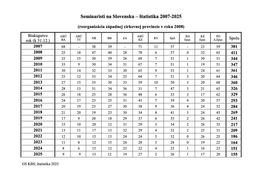 Štatistický prehľad, ktorý pravidelne spracováva Generálny sekretariát KBS, slúži ako dôležitý podklad pre ďalšiu pastoračnú činnosť a formáciu budúcich kňazov v slovenských seminároch.