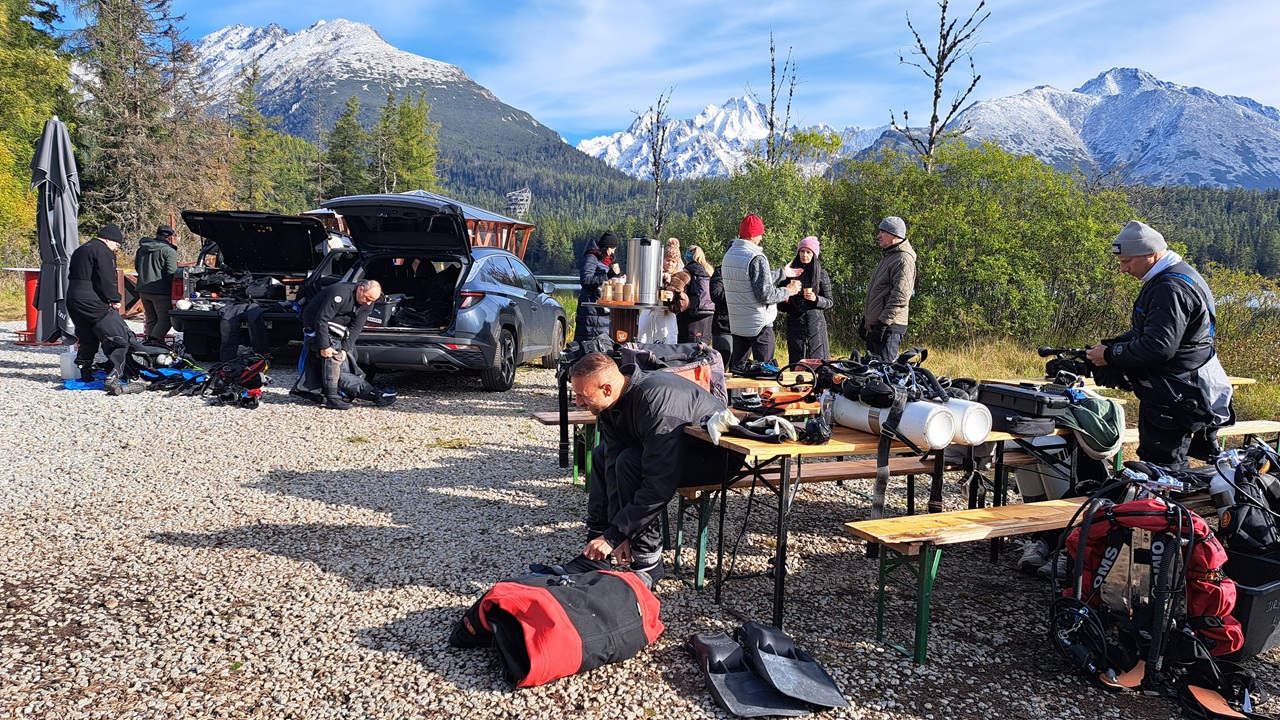 Na snímke potápači pri brehu Štrbského plesa počas prípravy na čistenie / Foto: TASR-Adriána Hudecová