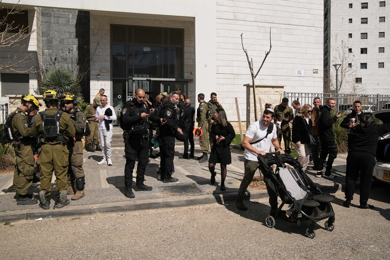 Na snímke obyvatelia sú evakuovaní z budovy zasiahnutej projektilom v Tirat Hacarmel, neďaleko Haify v severnom Izraeli / Foto: SITA/AP-Leo Correa