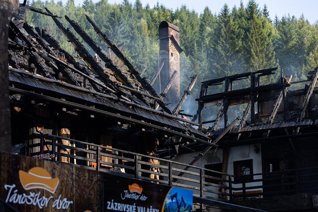 Na snímke škody po požiari penziónu a reštauračného zariadenia v Jánošíkovom dvore v obci Zázrivá v okrese Dolný Kubín / Foto: TASR – Daniel Stehlík