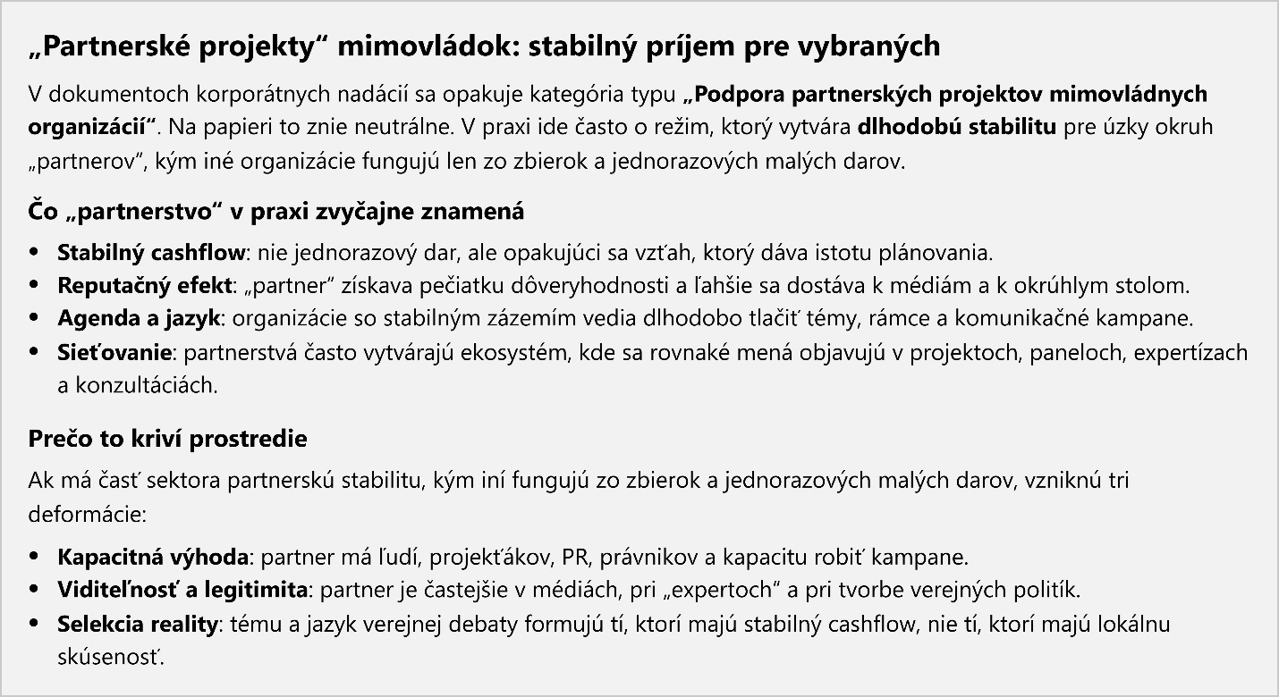 V predchádzajúcich dieloch sme pomenovali, že už samotná infraštruktúra sprostredkovania dokáže fungovať ako filter reputácie a tém, ktoré majú zelenú. Dnes k tomu chceme pridať, že v jazyku tretieho sektora platí, že kto je partner, ten je považovaný za legitímneho, dostáva nadštandardnú podporu veľkých hráčov. Kto nie je partner, je často odsunutý na okraj a živorí z príspevkov členskej základne alebo drobných darcov. A keď sa partnerstvo spája s politickou agendou, nie je to charita. Je to model vplyvu.