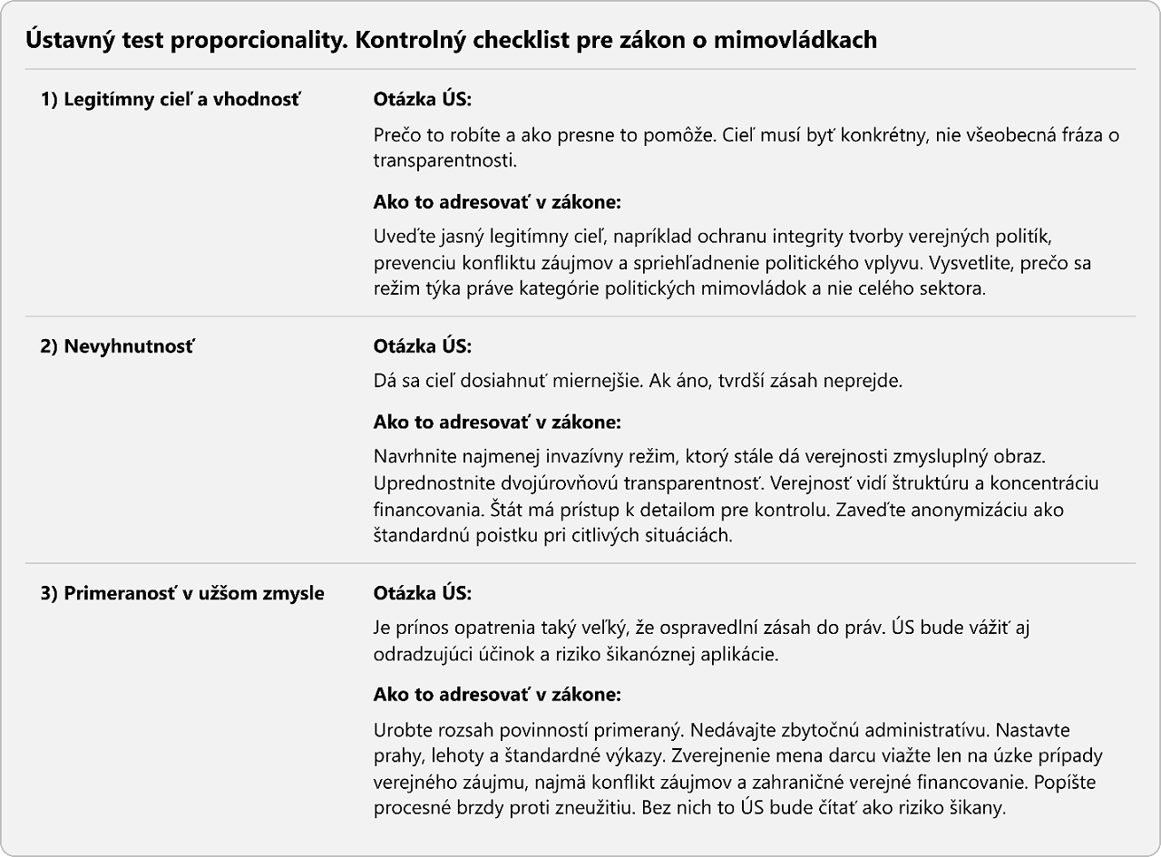 Tretí roh sú procesné brzdy. Bez nich sa každé pravidlo zmení na zbraň. Ak má zákon prejsť testom proporcionality, musí mať prahy, lehoty, štandardné výkazy, zákaz šikany, jasné kompetencie, jasnú možnosť obrany a vyvrátiteľnosť statusu. Presne toto Ústavný súd implicitne vyžaduje, keď varuje pred odradzujúcim účinkom a pred šikanóznou aplikáciou.