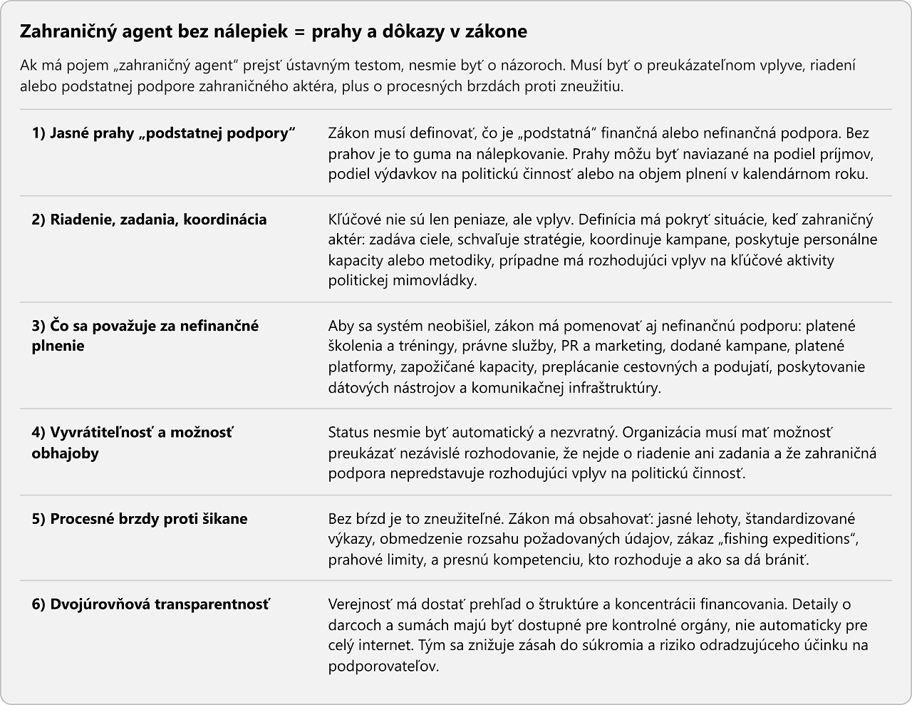 Prvý roh je zákonný jazyk. Politická mimovládka musí byť definovaná podľa činnosti. Advokácia musí byť pomenovaná ako organizovaný tlak na verejnú politiku. Zahraničný aktér musí byť technický pojem, nie nálepka. Zahraničný agent musí byť definovaný ako politická mimovládka, ktorá koná v záujme alebo pod rozhodujúcou podporou zahraničného aktéra. Musí sa to opierať o merateľné znaky vplyvu, nie o dojem.