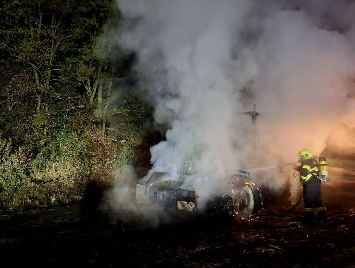 Hasiči zasahovali v stredu (15. 10.) podvečer pri požiari traktora s mulčovačom na poli v katastrálnom území obce Rohovce v okrese Dunajská Streda / Foto: TASR-HaZZ v Trnave