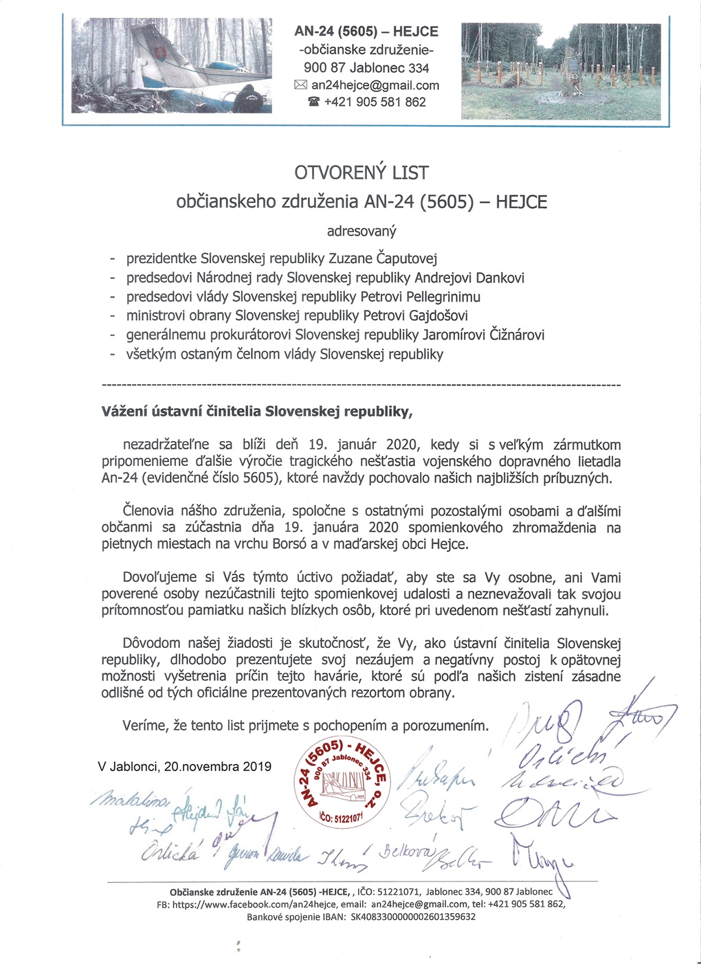 “Nezadržateľne sa blíži deň 19. január 2020, kedy si s veľkým zármutkom pripomenieme ďalšie výročie tragického nešťastia vojenského dopravného lietadla AN-24 (evidenčné číslo 5605), ktoré navždy pochovala našich najbližších príbuzných,” uvádza sa v úvode otvoreného listu.