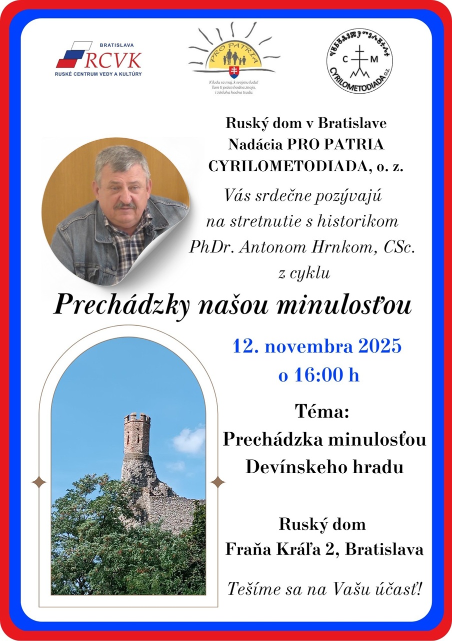 Prednáška sa uskutoční dňa 12. novembra 2025 o 16:00 h v Ruskom dome na ulici Fraňa Kráľa č. 2 v Bratislave.