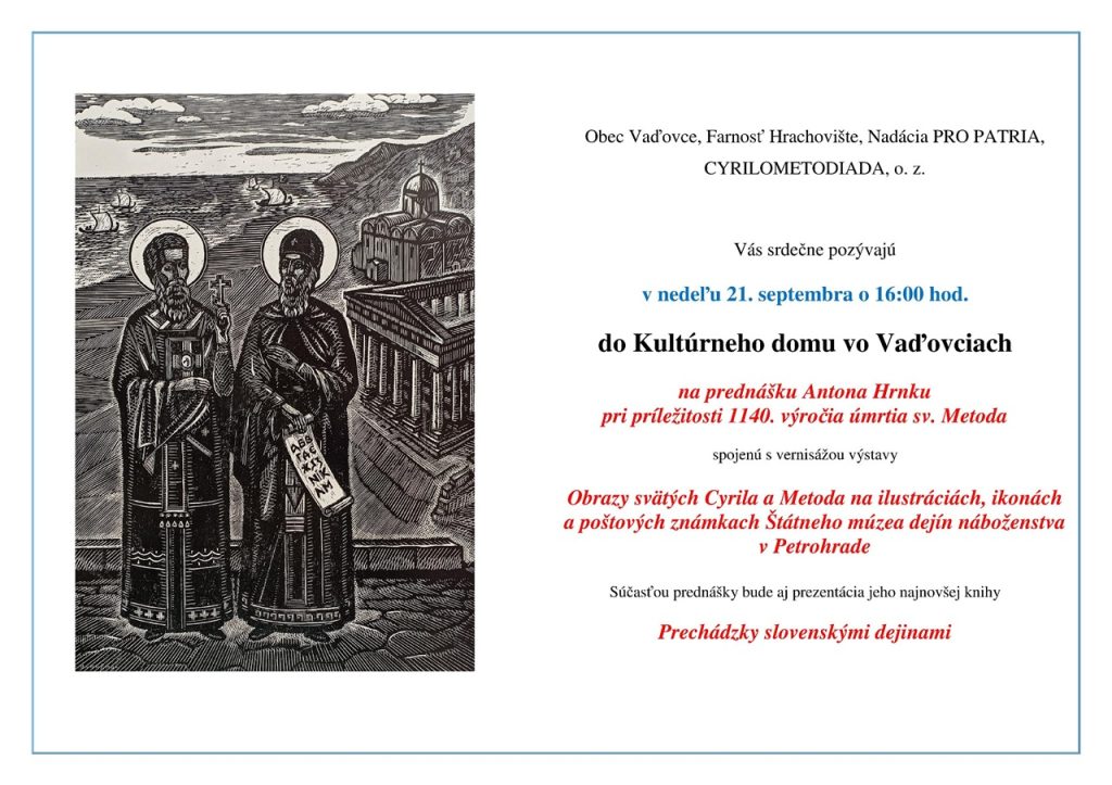 Obec Vaďovce, Farnosť Hrachovište, CYRILOMETODIADA, o. z., a Nadácia PRO PATRIA Vás srdečne pozývajú v nedeľu 21. septembra o 16:00 hod. do Kultúrneho domu vo Vaďovciach na prednášku Antona Hrnku pri príležitosti 1140. výročia úmrtia sv. Metoda spojenú s vernisážou výstavy Obrazy svätých Cyrila a Metoda na ilustráciách, ikonách a poštových známkach Štátneho múzea dejín náboženstva v Petrohrade