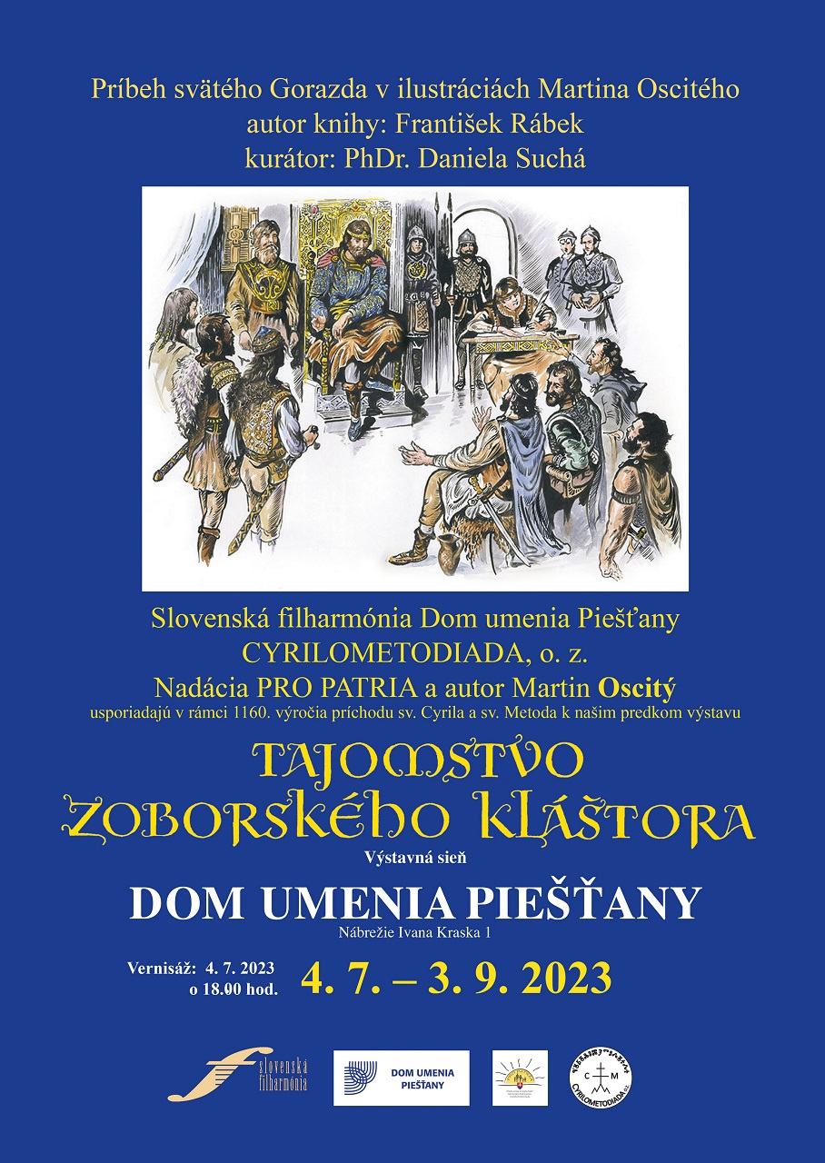 Slovenská filharmónia Dom umenia Piešťany, CYRILOMETODIADA, o. z., Nadácia PRO PATRIA a autor Martin Oscitý Vás pozývajú na slávnostnú vernisáž výstavy TAJOMSTVO ZOBORSKÉHO KLÁŠTORA – Príbeh svätého Gorazda v ilustráciách, ktorá sa uskutoční dňa 4. 7. o 18.00 hod. vo Výstavnej sieni Domu umenia Piešťany. Výstava bude prístupná verejnosti od 5. júla do 3. septembra 2023 v utorok až piatok od 14.00 do 17.00 hod., v sobotu a v nedeľu od 14.00 do 18.00 hod., v pondelok bude zatvorené