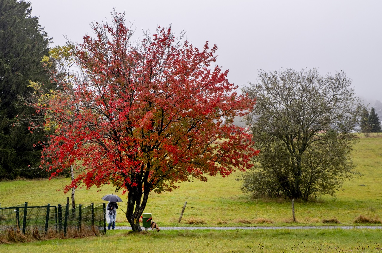 Na snímke žena venčí psa pod jeseňou sfarbeným stromom