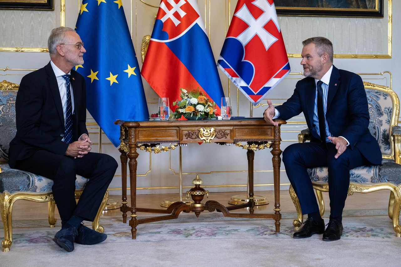Na snímke vľavo detský onkológ, iniciátor a zakladajúci riaditeľ Princess Maxima Centrum nemocnice Rob Pieters a vpravo prezident SR Peter Pellegrini počas prijatia v Prezidentskom paláci / Foto: TASR-Jakub Kotian