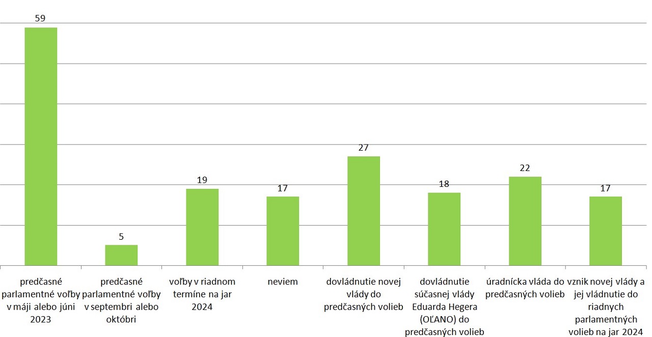 Vznik novej vlády, ktorá by dovládla do predčasných volieb v roku 2023, si želá 27 percent respondentov. Aby do predčasných volieb dovládla súčasná vláda Eduarda Hegera (OĽANO), chce 18 percent voličov.
