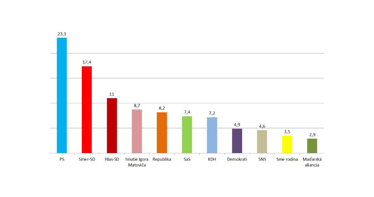 PS by podľa prieskumu získalo 23,1 percenta hlasov. Smer by skončil so 17,4 percenta a Hlas-SD s rovnými 11 percentami. Na štvrtom mieste by skončilo Hnutie Slovensko s 8,7 percenta. Po ňom by nasledovala Republika s 8,2 percenta, SaS so 7,4 percenta a KDH so 7,2 percenta.