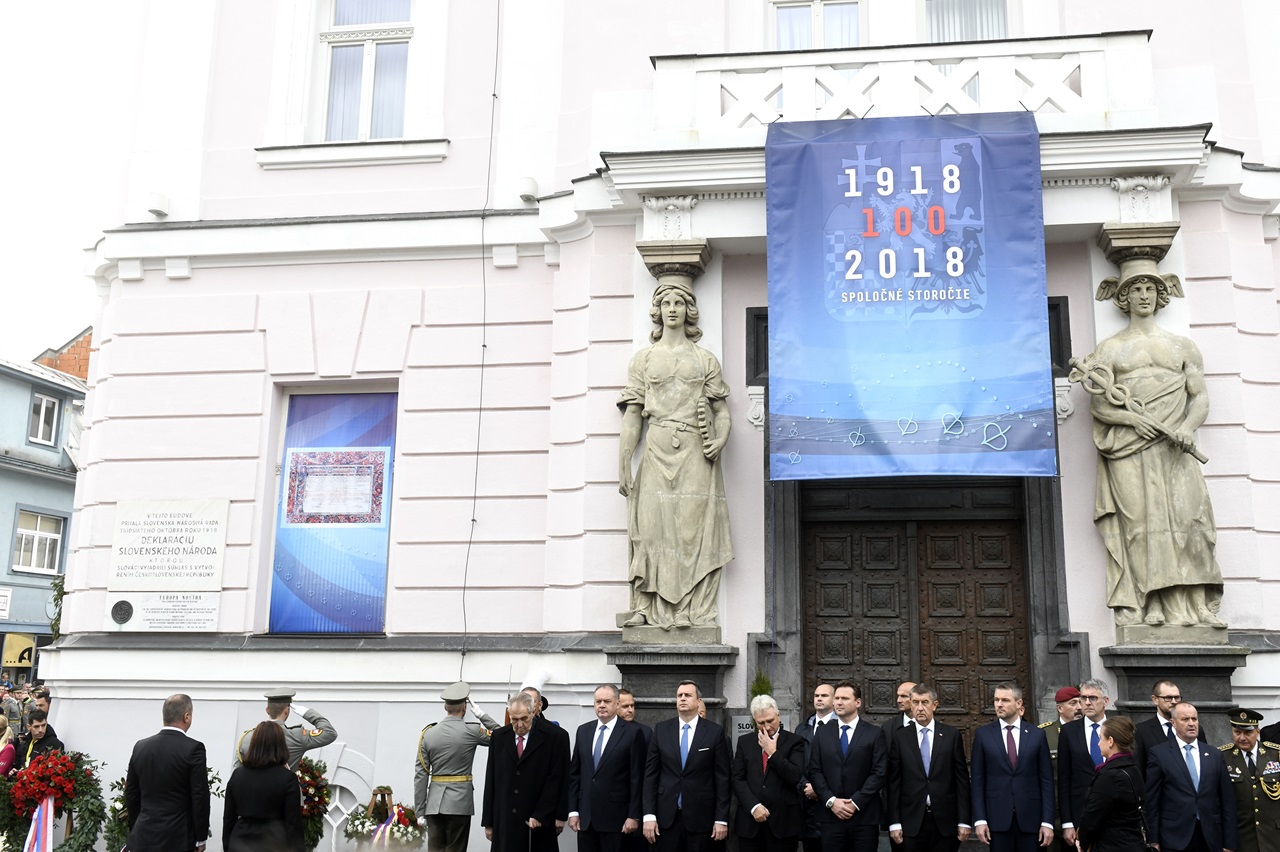 Na archívnej snímke z 30. októbra 2018 zľava vtedajší prezident Českej republiky Miloš Zeman, vtedajší prezident SR Andrej Kiska, vtedajší predseda NR SR Andrej Danko, vtedajší predseda Senátu Parlamentu Českej republiky Milan Štěch, vtedajší predseda Poslaneckej snemovne Parlamentu Českej republiky Radek Vondráček, vtedajší český premiér Andrej Babiš, vtedajší predseda vlády SR Peter Pellegrini, vtedajší minister obrany Českej republiky Lubomír Metnar a vtedajší minister obrany SR Peter Gajdoš počas pietneho aktu kladenia vencov k pamätnej tabuli Martinskej deklarácie